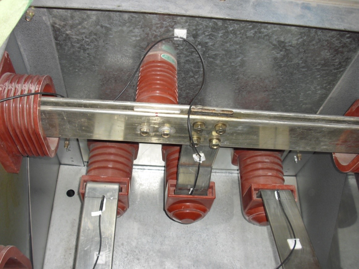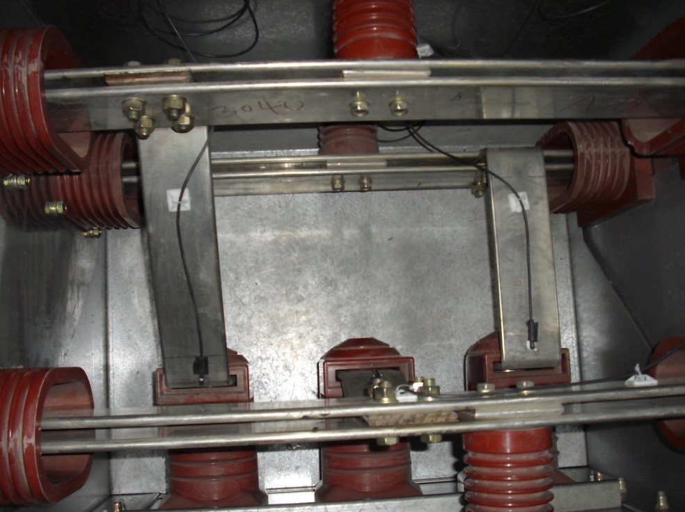 传感器安装在10kv/35kv母排上,光缆要顺着自身母排的绝缘橡胶套走缆。距传感器安装10cm处要用定位吸盘固定紧,尽量避免光缆在柜内缠绕。盘圈的光缆要固定整齐,安装后要求传感器信号正常、安全无隐患。