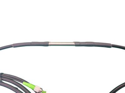 感温敏感单元包括光纤光栅、密封壳体及引出光缆三部分。其工作原理为通过对沿光缆远程传输来的入射宽带ASE光源(总功率小于20mW)进行选择性反射,将被检测的温度量转换为波长线性变化的窄带反射光信号,沿入射光缆原路返回。光纤光栅感温敏感单元安装布设在油罐、隧道等需要进行火灾监测的危险区域,通过光缆连接到监控室等安全区域内放置的信号处理器,从而实现对火灾的实时探测。每一通道的敏感部件由多个(最多24个)感温敏感单元串接组成。感温敏感单元的基本结构如下图所示。